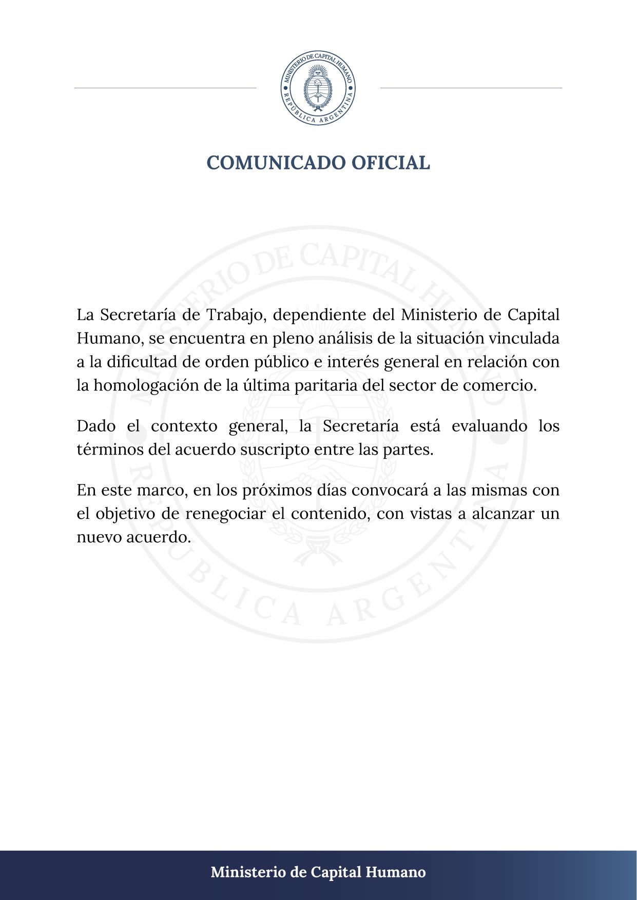 Por otra parte, la Secretaría de Trabajo, dependiente del Ministerio de Capital Humano, informó de forma oficial que se encuentra en pleno análisis la situación vinculada a la homologación de la última paritaria del sector de comercio, por tanto en los próximos días se convocará a las partes con el objetivo de renegociar el contenido, con el fin de alcanzar un nuevo acuerdo.