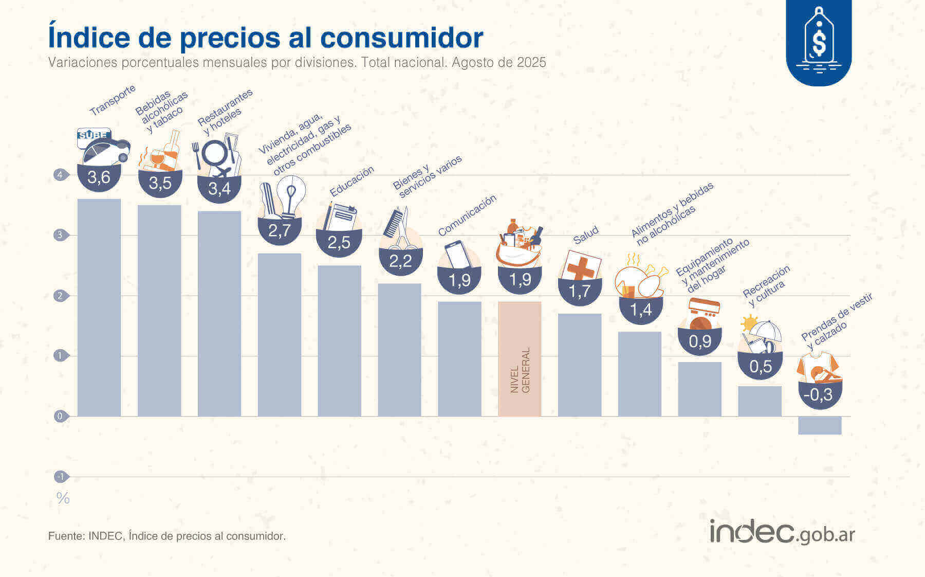 En tanto, que las dos divisiones que registraron las menores variaciones en agosto fueron Recreación y cultura (0,5%) y Prendas de vestir y calzado (-0,3%).