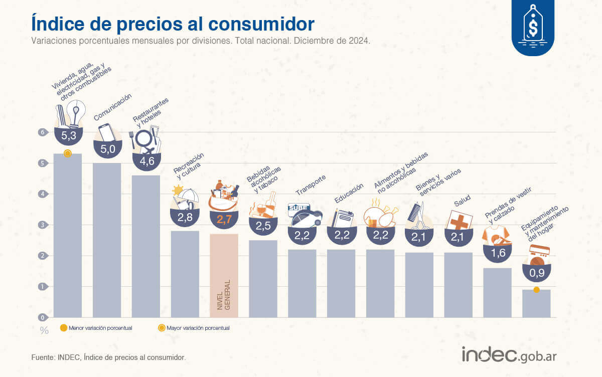 El Instituto Nacional de Estadísticas y Censos (Indec) informó este martes que el Índice de Precios al Consumidor (IPC) de diciembre llegó al 2,7%, por lo que tuvo un acumulado total de 117,8% para 2024.