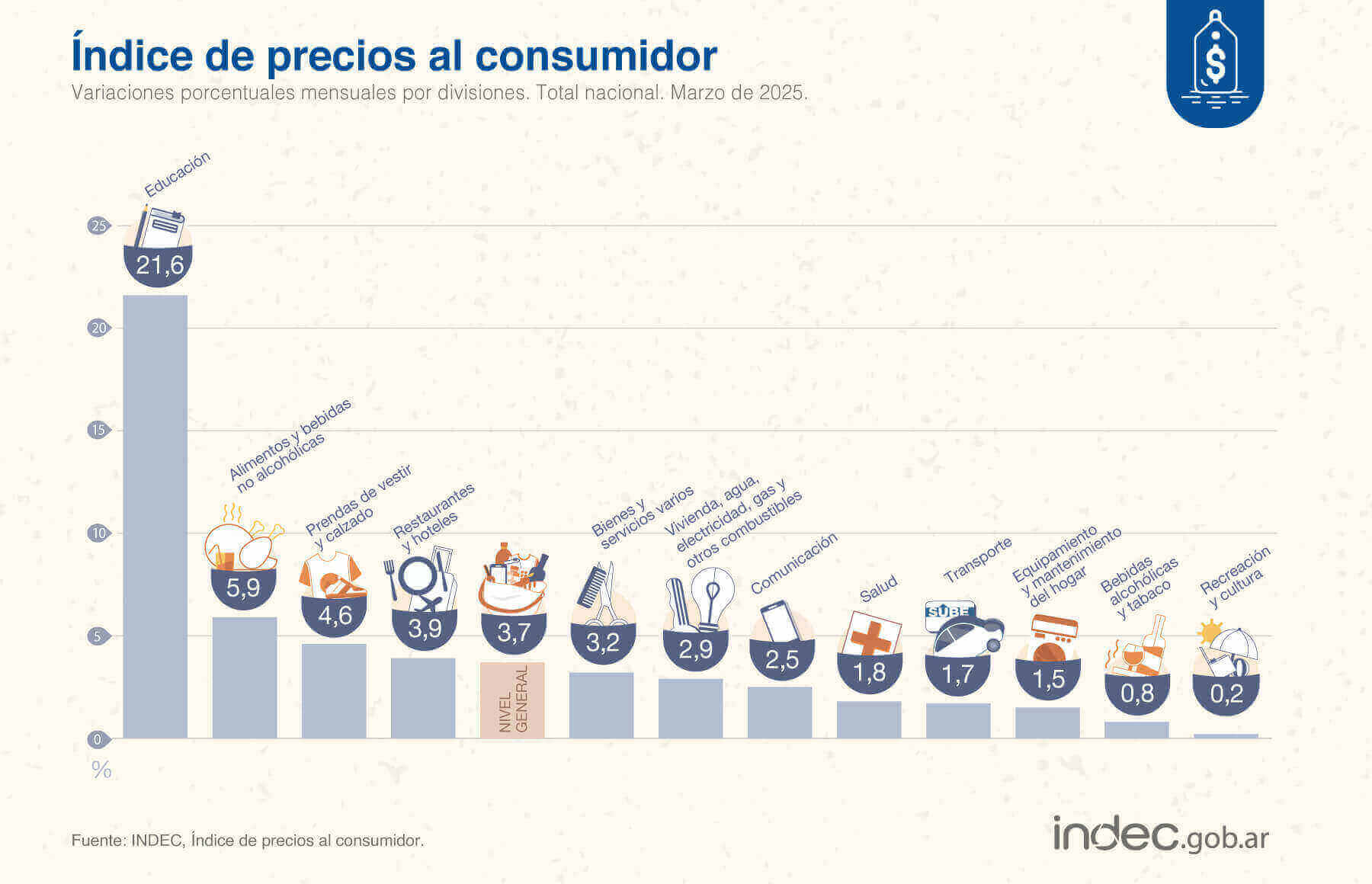 El índice de Precios al Consumidor del mes de marzo alcanzó el 3,7% y acumula 8,6% en 2025. Educación y Alimentos lideraron los aumentos.