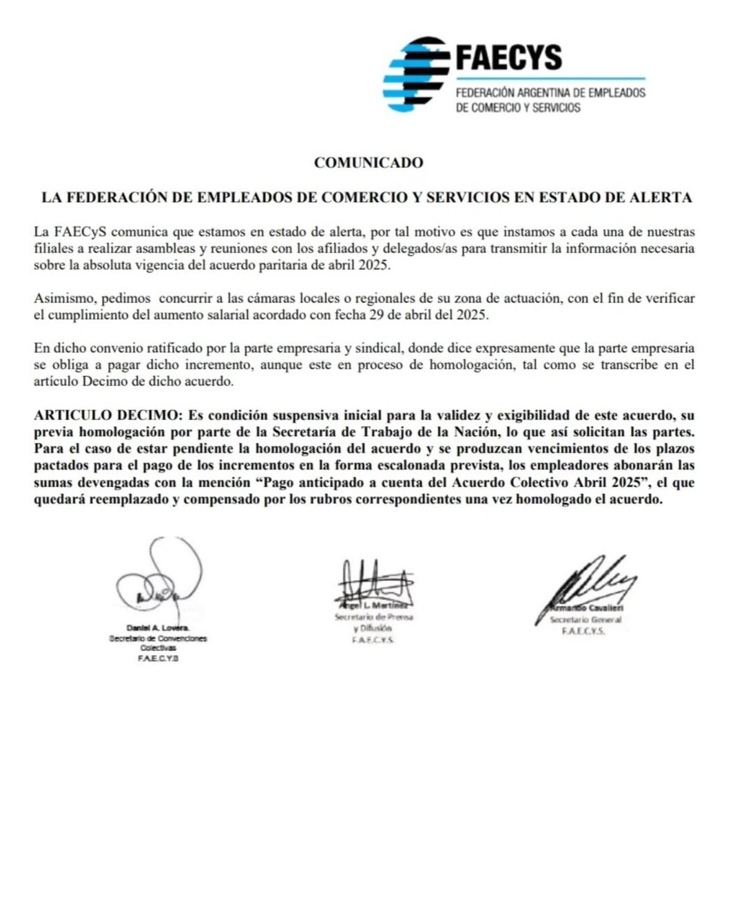 Debido a la falta de homologación del último tratado remunerativo, la FAECYS comunica que se encuentran en estado de alerta e insta a sus distintas filiales a realizar asambleas y reuniones para trasmitir la información respecto a la absoluta vigencia del pacto paritario de abril 2025.