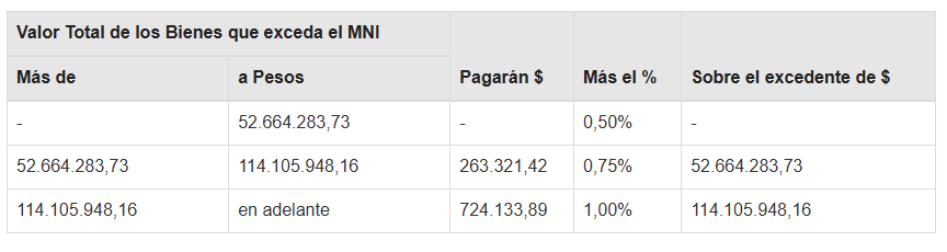 El gravamen a ingresar será el que resulte de aplicar, sobre el valor total de los bienes situados en el país y en el exterior sujetos al impuesto, excepto las acciones y participaciones que deban ser declaradas por las personas jurídicas en carácter de responsables sustitutos, que exceda de $ 384.728.044,57, la siguiente escala: