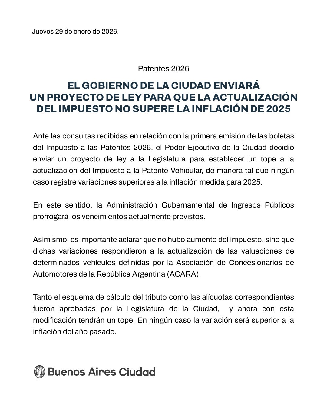 Ante las inquietudes generadas por la primera emisión de las boletas del Impuesto a las Patentes 2026, el Gobierno de la Ciudad Autónoma de Buenos Aires anunció el envío de un proyecto de ley a la Legislatura para limitar la actualización del tributo.